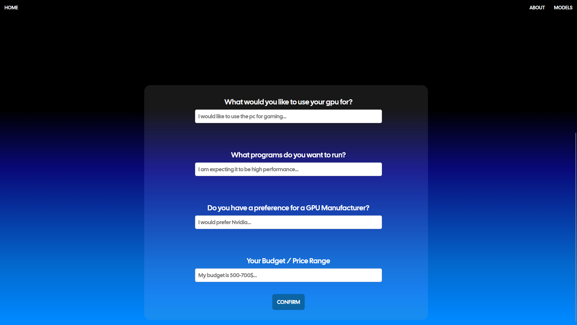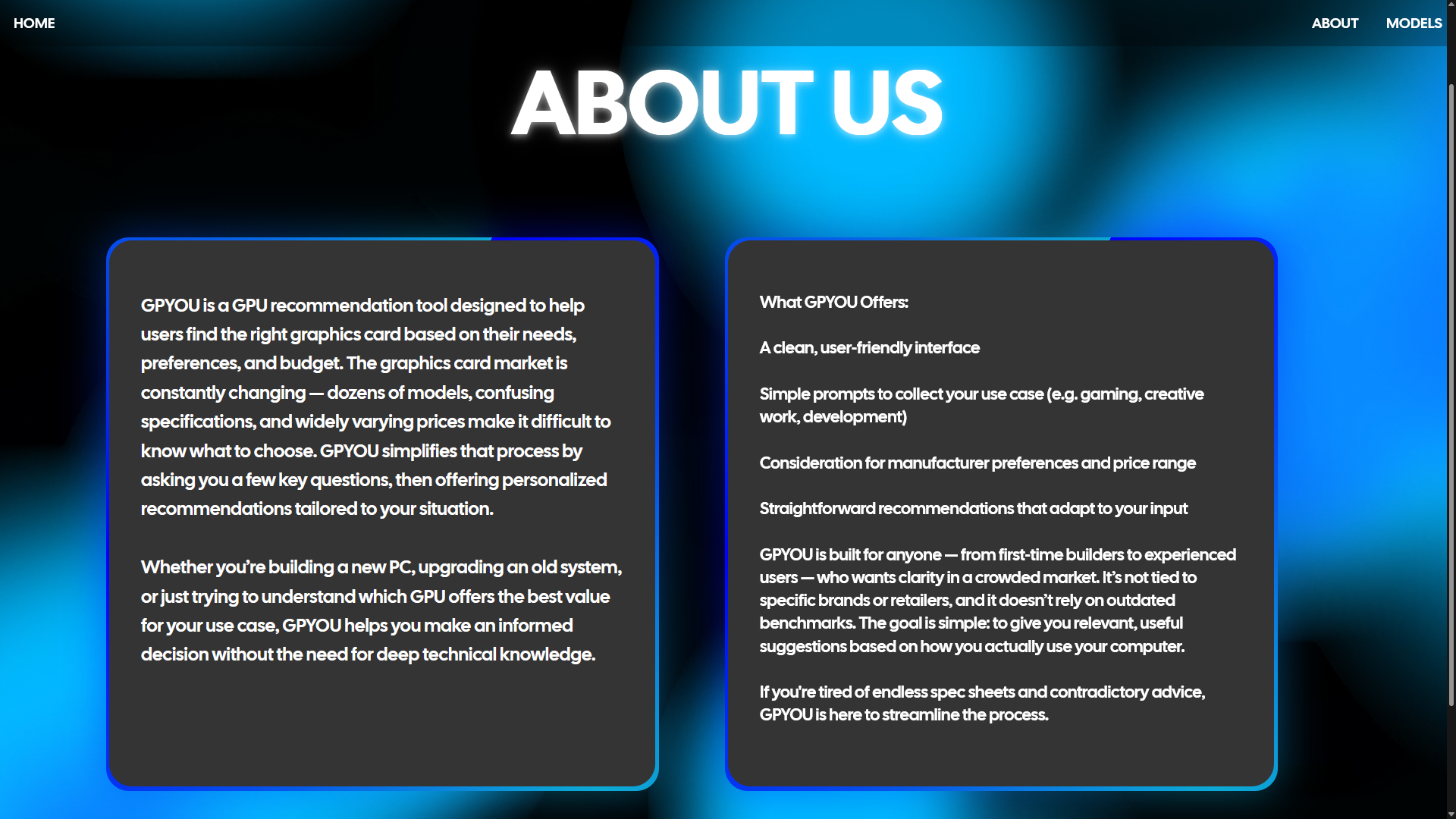 GPYOU analyzes four non technical user inputs including needs, performance expectations, resolution goals, and budget preferences. Using those inputs the app determines an ideal GPU tier and presents a clear and concise recommendation with supporting information.